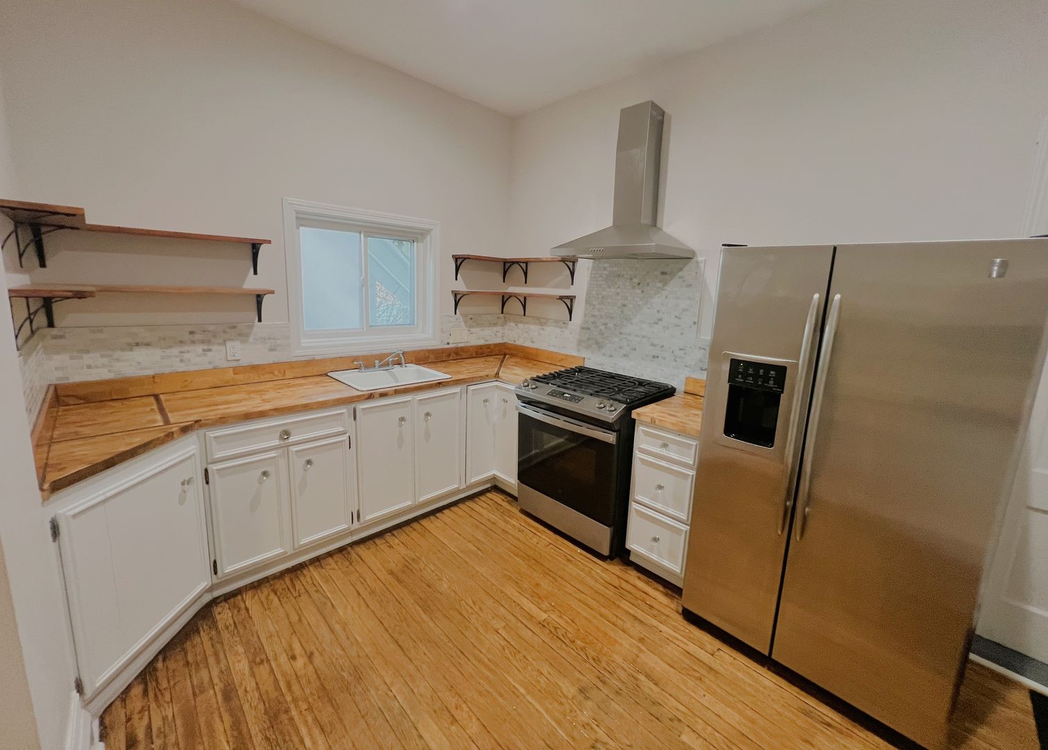 Step into this beautifully refreshed, character-rich apartment that blends classic architectural charm with modern convenience. High ceilings, tall windows, and warm hardwood floors create a bright, inviting atmosphere throughout. The updated kitchen includes stainless steel appliances, a gas range, a spacious side-by-side refrigerator, and a stylish range hood. Custom wood countertops and open shelving provide warmth and functionality, paired with crisp white cabinetry and a stone tile backsplash. The room’s layout makes cooking easy and enjoyable. A stunning, oversized living room features a bay of large windows that flood the space with natural light. Original wood floors detailed trim work, and a decorative mantle add elegance, while a modern ceiling fan brings updated comfort. The additional rooms showcase more beautifully detailed mantles with built-in shelving and plenty of storage.